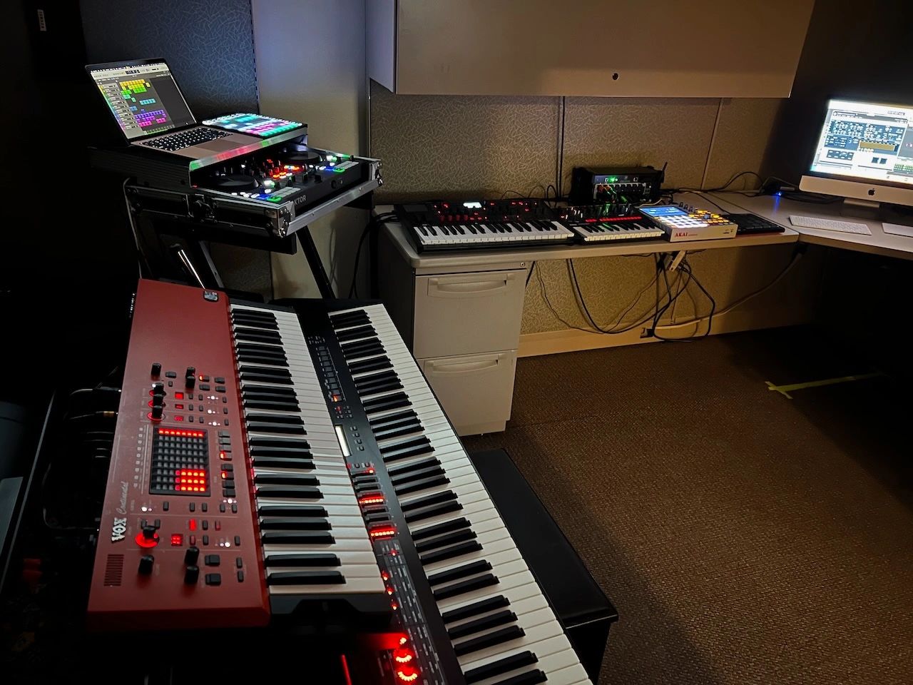 Students dive into hands-on exploration with analog and digital synths, MPCs, V-Drums, mics, reactive lights, and a full mixing board, surrounded by gear that glows, pulses, and responds to their imagination. At the heart of it all: a powerful iMac loaded with Logic Pro, NI Komplete, and Arturia’s V-Collection, giving students real tools to turn theory into sound. Whether they’re crafting beats, sculpting synth tones, or layering textures, every session is an experiment in self-expression. It’s part classroom, part laboratory, and all about learning by doing.